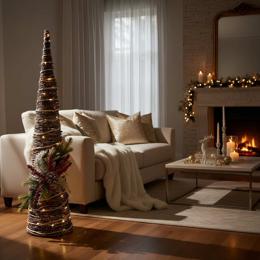 Es el punto de partida y el símbolo de reunión. Lo ideal es elegir un árbol frondoso y proporcionado al espacio, mantener una paleta de dos o tres tonos y combinar texturas. La luz cálida crea sensación de refugio, mientras los adornos —de vidrio, tela o madera— aportan profundidad y vida. - Rincón de encanto con villas o pesebres